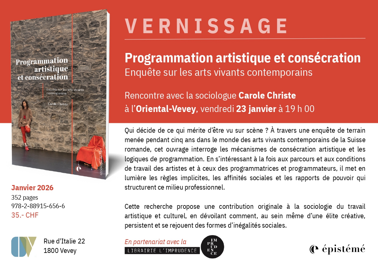 Vendredi 23 janvier 2026 à 19h La sociologue Carole Christe vous convie à la présentation de son livre "Programmation artistique et consécration" récemment paru. |